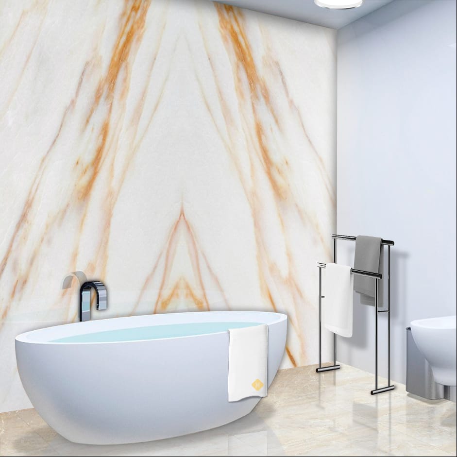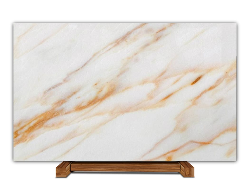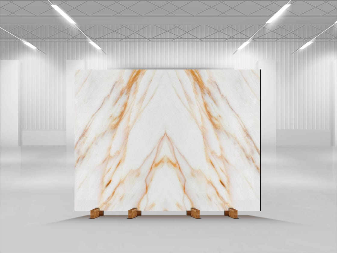 The Calacatta Champagne Italian Marble is a masterpiece of natural opulence, boasting a soft, creamy white background elegantly veined with warm, golden hues that evoke the effervescence of champagne. Its sophisticated, luxurious beauty exudes refinement, warmth, and timeless elegance, creating a truly majestic atmosphere. Perfect for discerning tastes, Calacatta Champagne is a treasured choice, infusing any space with an aura of lavish sophistication, classic charm, and enduring beauty that whispers luxury and refinement.