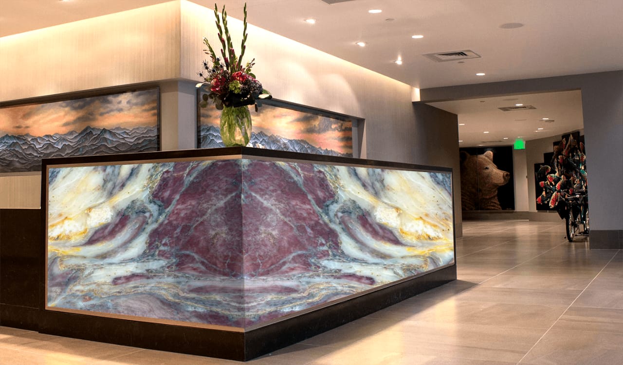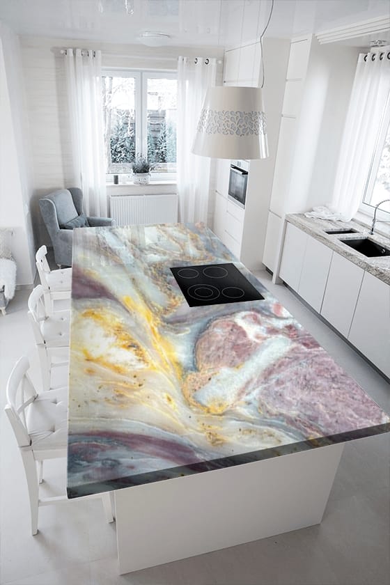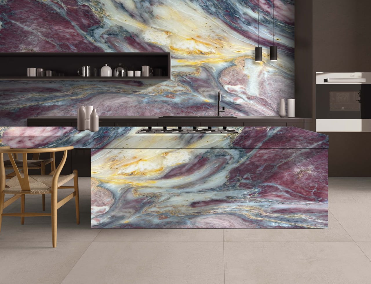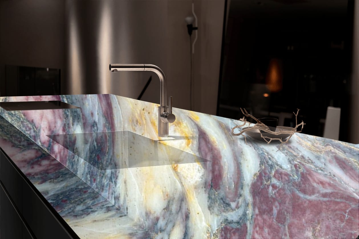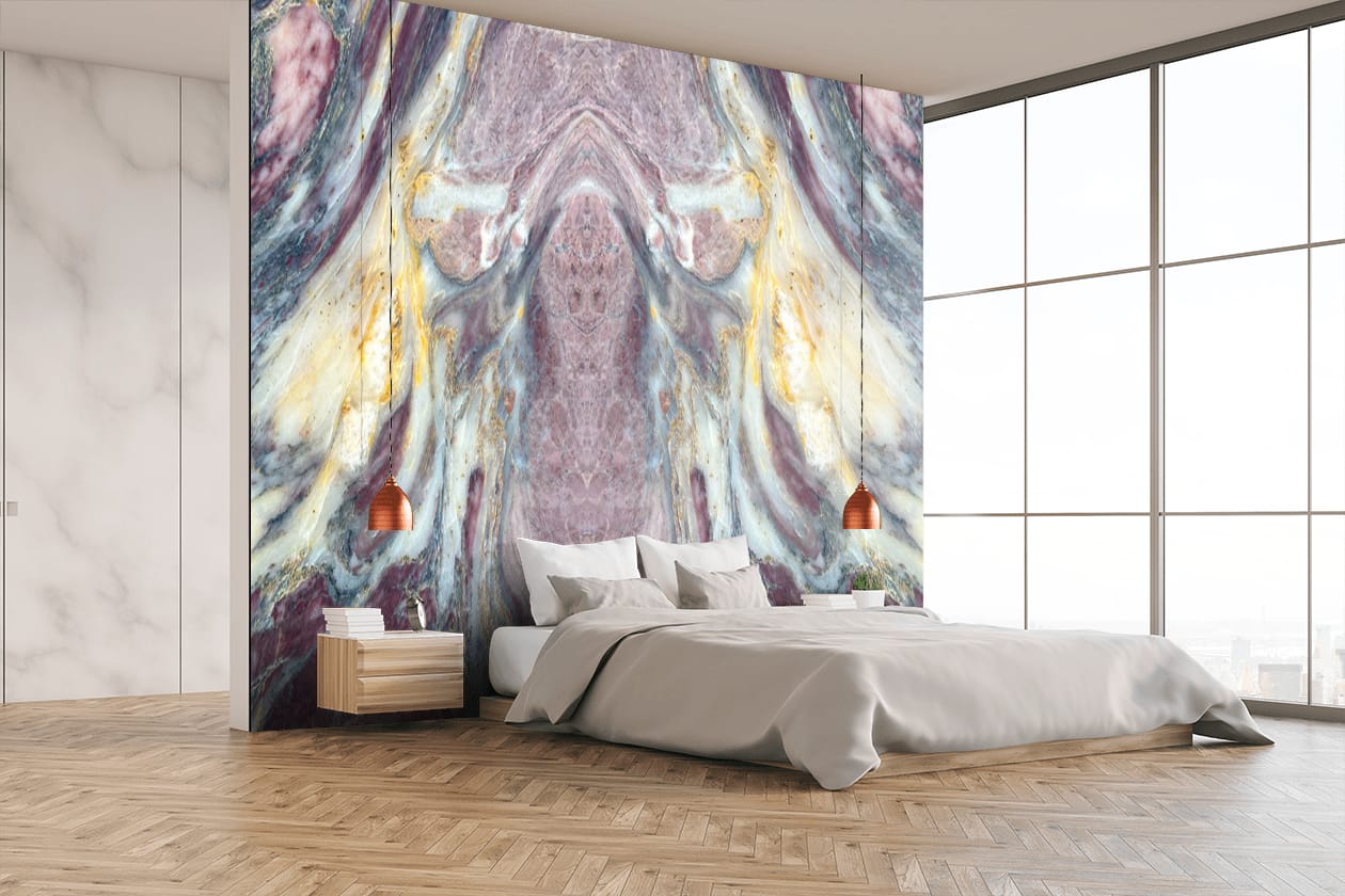 The Fico Di Amalfi Indian Quartzite is a breathtaking masterpiece of natural luxury, showcasing a rich, dark gray background with intricate, swirling patterns of gold, cream, and soft brown hues, reminiscent of a starry night sky. The polished finish adds a touch of sophistication and elegance, perfect for high-end interiors where luxury and refinement reign. This exquisite quartzite exudes drama, elegance, and natural beauty, its intricate patterns and subtle nuances creating a sense of wonder and awe. The Fico Di Amalfi’s unique blend of dark, mysterious tones and shimmering metallic hues transports you to a world of opulence and sophistication, elevating any space to new heights of luxury and refinement.